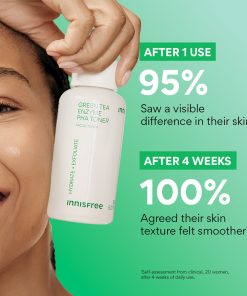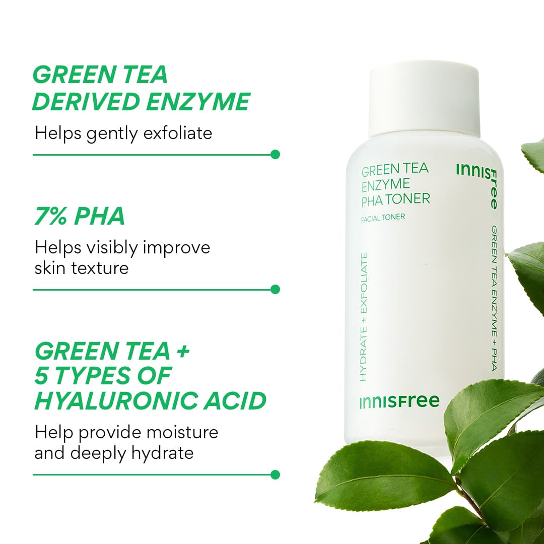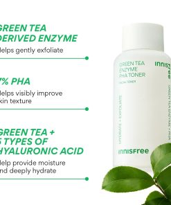 The Innisfree Green Tea Enzyme PHA Toner is a gentle, leave-on PHA toner with 7% PHA and green tea enzyme that hydrates, smooths, and refines rough texture. This hydrating toner for sensitive skin evens out tone while leaving skin plump, soft, and glowing. Perfect as part of your Korean skincare toner routine, it refreshes daily, supports healthy-looking skin, and preps your complexion to absorb serums and moisturizers. Use morning or night for a soothing, radiant finish and enjoy visibly smoother, balanced, and hydrated skin with every use.